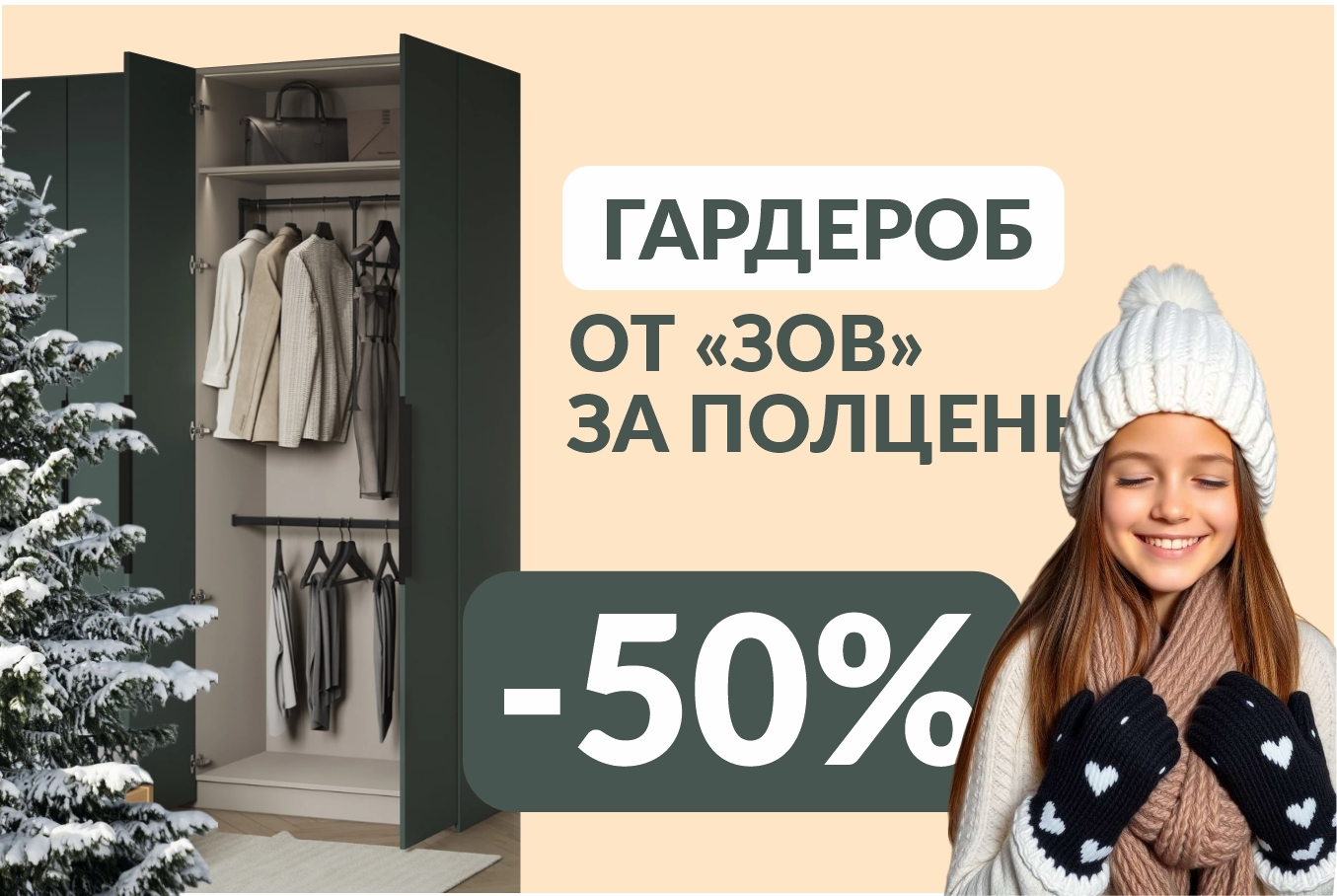 Только до конца января 2026 при заказе кухни в салонах «ЗОВ» действует специальное предложение — скидка 50% на гардеробные шкафы, стеллажные и раздвижные системы.