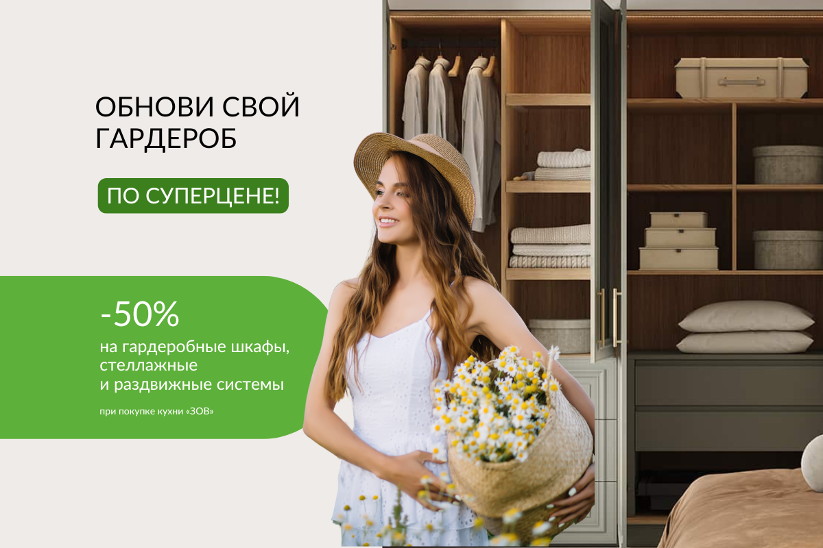 Только до конца декабря при заказе кухни в салонах «ЗОВ» действует специальное предложение — скидка 50% на гардеробные шкафы, стеллажные и раздвижные системы.