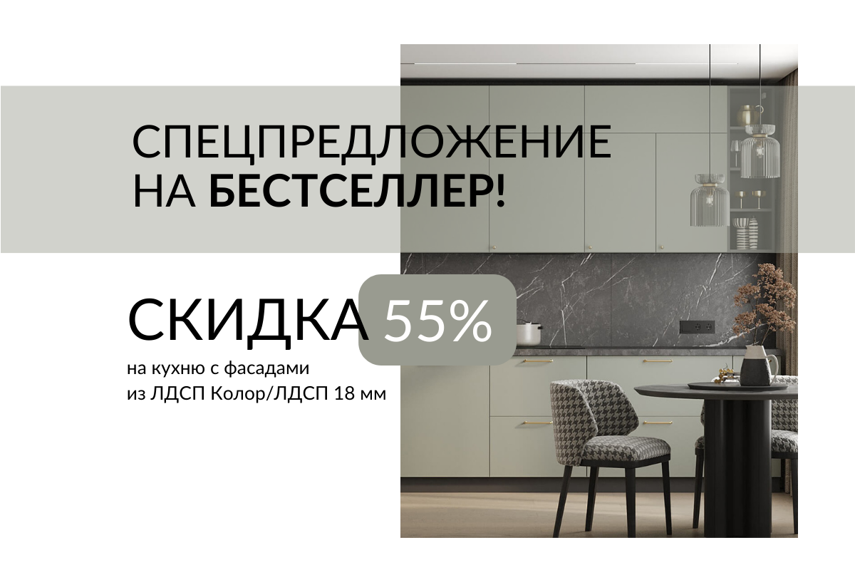 Только до конца декабря в салонах «ЗОВ» действует специальное предложение — невероятная скидка в размере 55% на кухонную мебель по индивидуальному проекту с фасадами из ЛДСП Колор и ЛДСП 18 мм.