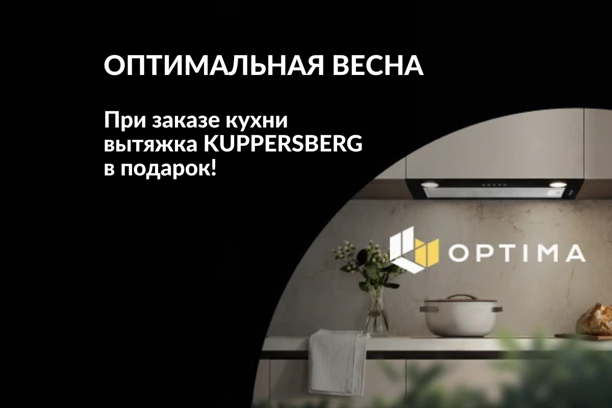 Только до конца мая оформите заказ на модульную кухню ОПТИМА, и мы порадуем вас отличным подарком — вытяжкой бренда KUPPERSBERG на ваш выбор ↓